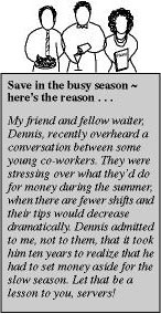 What you need to keep in mind, with all that cash burning a hole in your pocket, is that you can't count on a paycheck to cover your bills. You have to set aside money for your rent, mortgage, utilities, car payment . . . And set a little aside, too, to treat the chefs to a drink or a cup of coffee next time they join you after the shift. Chefs are notorious for not having cash -- and servers always do. Consider this another way to improve relations between front and back of house. I've heard young waiters say, "I sure don't see myself doing this when I'm 50 years old." Well, you don't have to. Restaurant service is definitely not a dead-end career. There are lots of things that you can do after youâve had a successful career as a server, often while staying in the food service industry. Many servers go into restaurant management. Hotels, resorts and country clubs provide many opportunities to move up the career ladder. They'll often pay for you to go to school if you choose to continue your education. The larger hotel chains offer management schools and classes once you've been with the organization for a length of time. Servers can eventually become Food & Beverage Directors or General Managers of hotel restaurants. Many servers also choose to go into the banquet side of the business to become catering and sales managers. They start up their own businesses or work for independent caterers. Some go into other areas of tourism, working for convention and visitors' bureaus, air and cruise lines. Many open their own restaurants. Still others, like myself, become teachers or restaurant consultants. Often, servers are recruited by automobile dealerships and insurance companies for their sales abilities. There are many things you can pursue if and when you become tired of waiting tables. Let's look at some of the qualifications and qualities of a good server . . . |