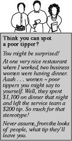 First, what are tips? Tips is an acronym. It stands for: (okay, grammatically, it's to ensure prompt service, but you get the point!) Tipping isn't mandatory. Nor is it a city in China, as the old restaurant joke goes. It is, however, a longstanding custom in the United States. In Europe and many parts of the Caribbean, the tip is usually added directly to the guest check. In Japan, tipping is not generally expected unless some extra service has been performed. Until recently in China, it was inappropriate to tip. Times are changing there but, even now, only a 3% tip is the norm (and it's often appreciated if that tip is paid in U.S. dollars). In Hong Kong, servers expect at least 10% on top of any service charge that's levied. In Australia, some restaurants have a no-tipping policy, at other, the standard is 10%. There's a difference, though, between tips and service charges. Tips are intended solely for the service team. Service charges may be distributed any way that management feels is fair. In some cases, a portion of a service charge goes to the kitchen employees, who don't otherwise work for tips. Throughout my career, most of my two-week paychecks were for this amount: $0.00. Very few servers are paid the standard minimum wage. Because of their profession, most are paid an hourly rate of just $2.20, or thereabouts (Yes, this is legal, since it's assumed that they'll make up the rest in tips). By the time your taxes and any medical payments are deducted, your meager paycheck has disappeared. When I work as a server, I never look at individual tips. It doesn't really make any sense to do that since it all averages out in the long run. If I peek and see a good tip (18% or higher), it momentarily pleases me. If I look and see a poor tip (less than 15%), it's going to upset me and I'll lose focus on the other tables I have to serve. And, in the grand scheme of things, what does it matter? I do suggest that you keep a log of your tips and, at the end of the month, take a look at the total. If you're happy with what you've made, great. If not, itâs time to look for a new job.